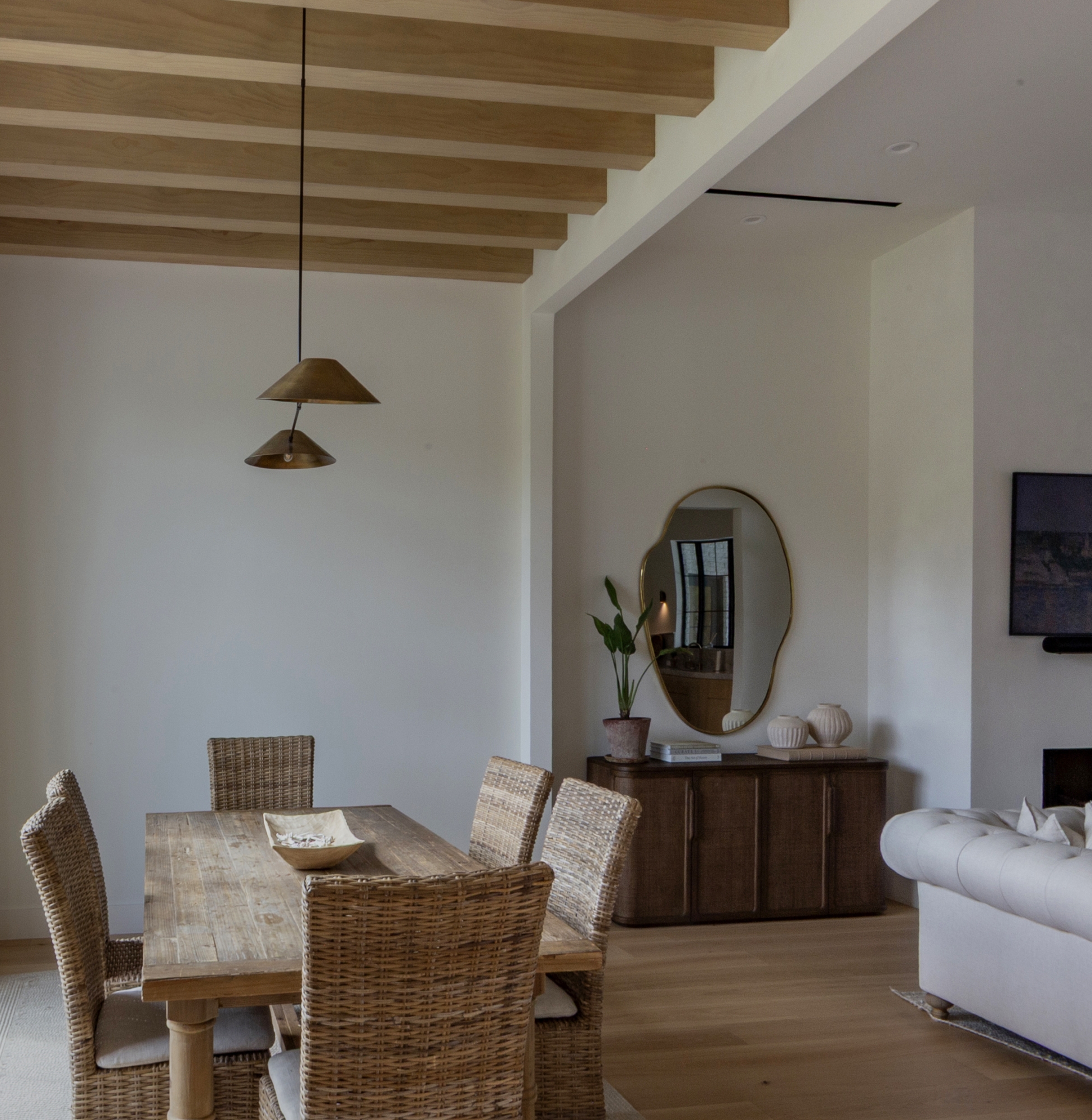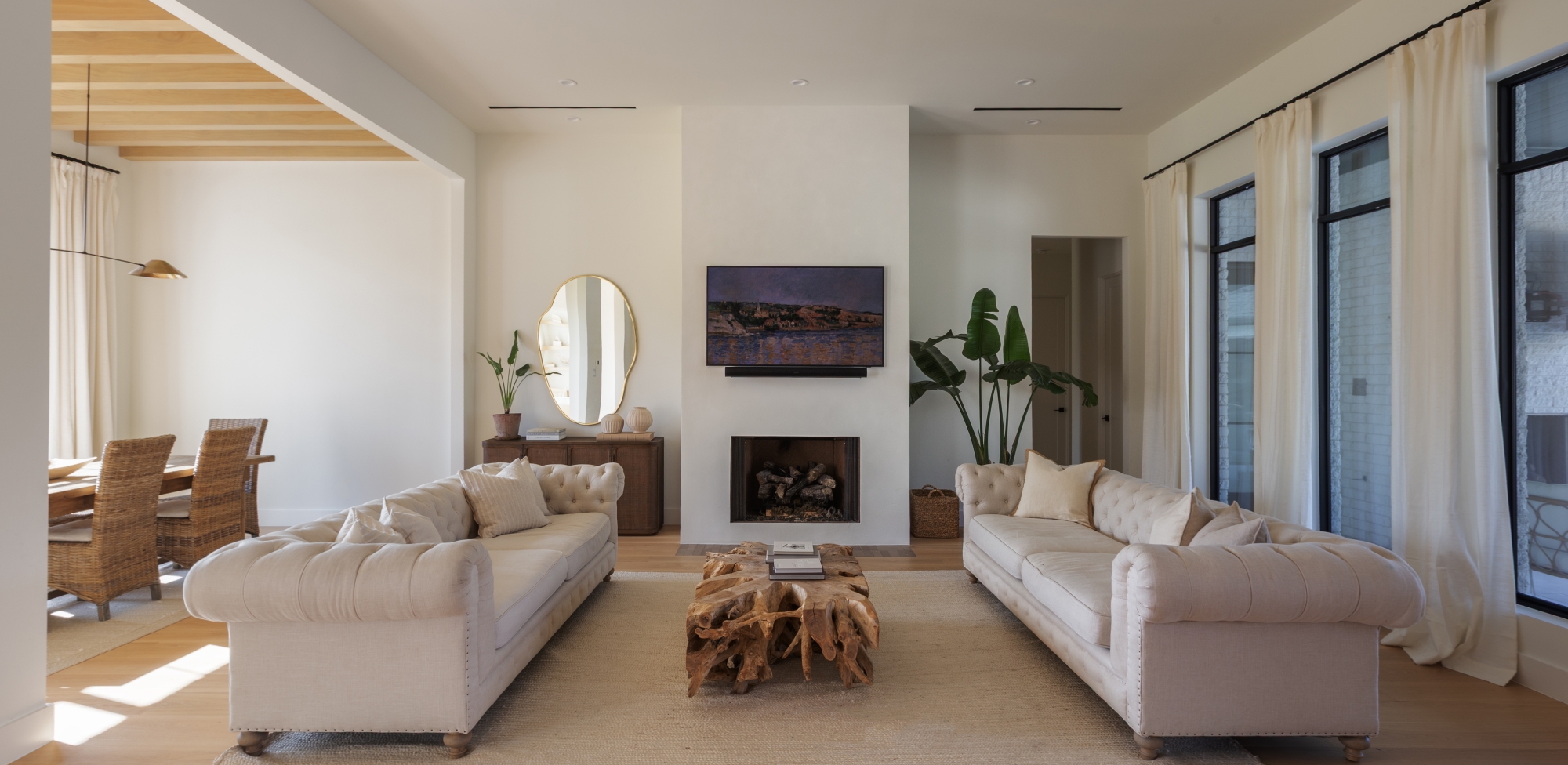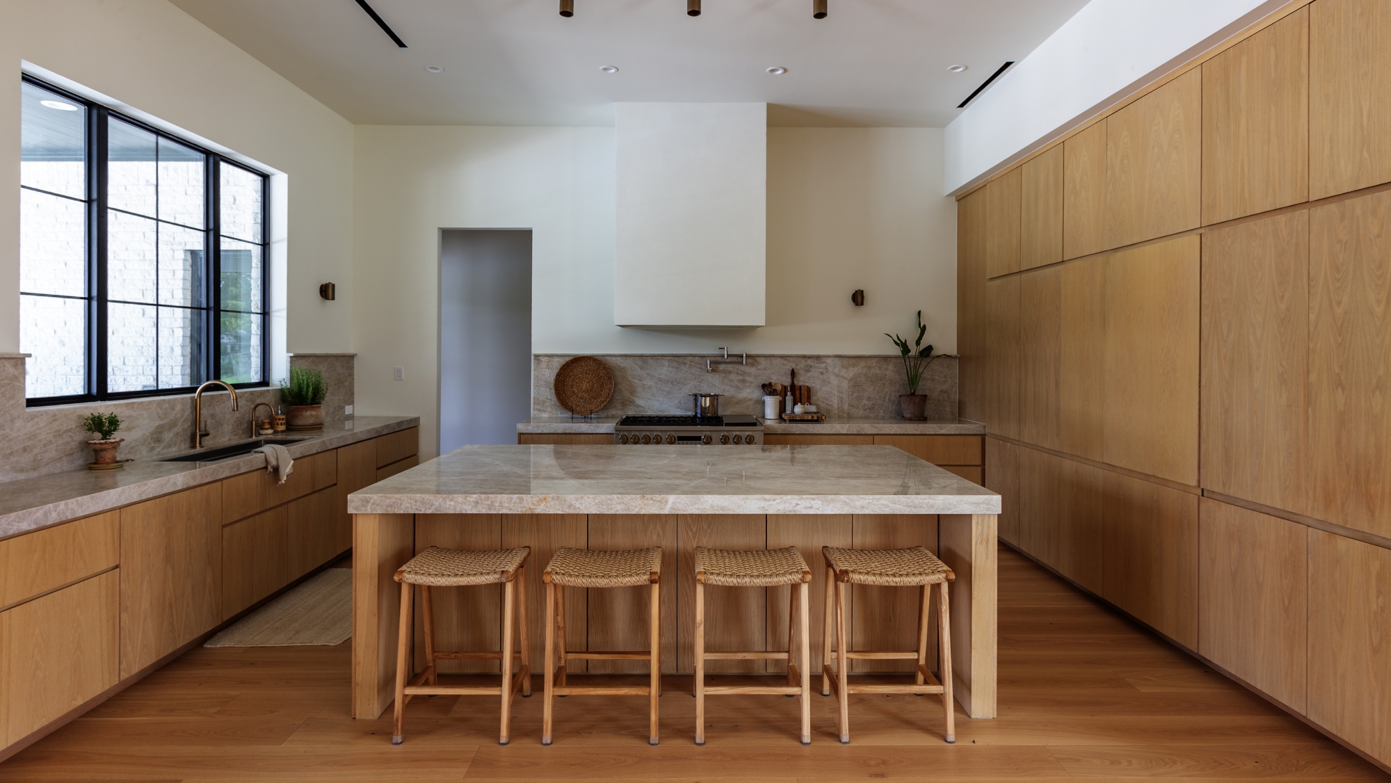 Our Meadowhurst project is a study in organic modern design—where natural textures meet refined minimalism. White oak floors and cabinetry anchor the home in warmth, while handmade beams, Taj Mahal countertops, and zellige tile bring layers of artisanal character. A plaster fireplace and aged brass details complete the look, blending timeless character with modern sensibility.