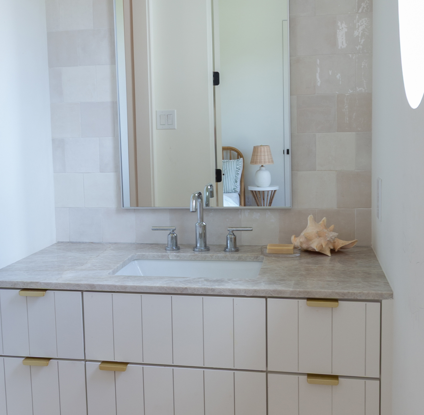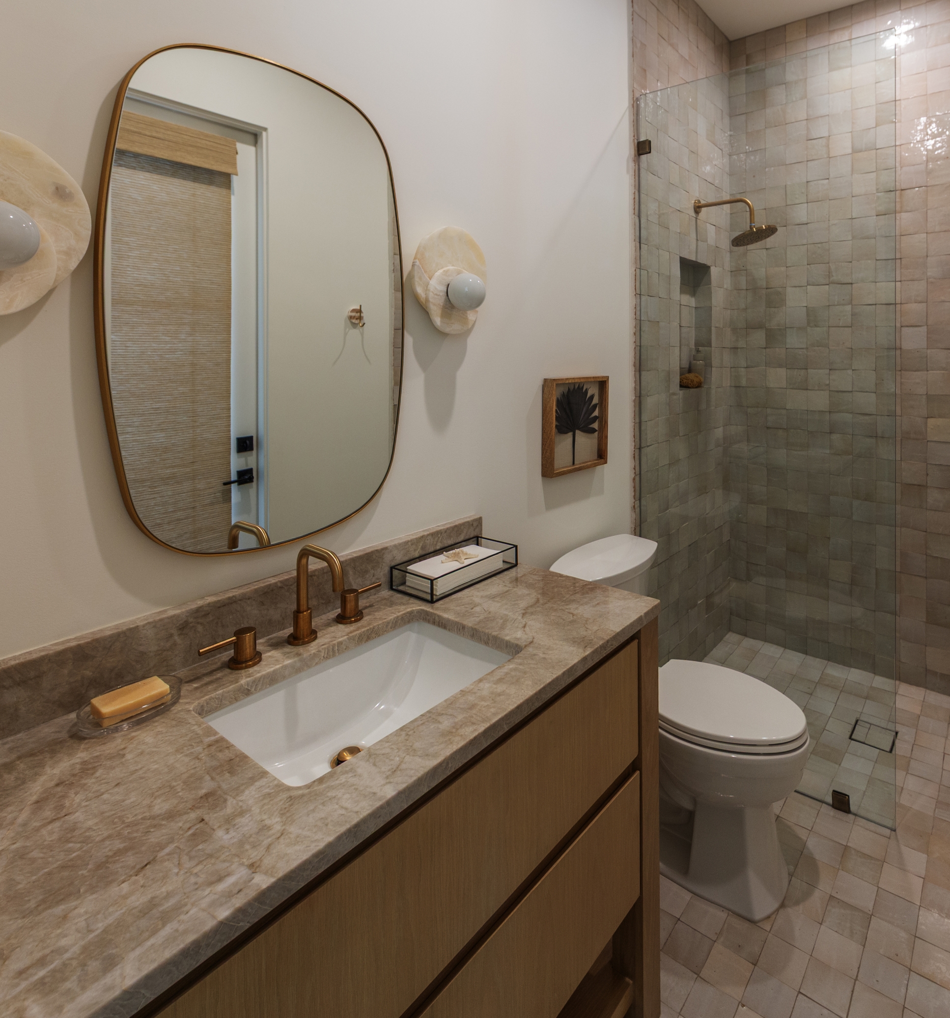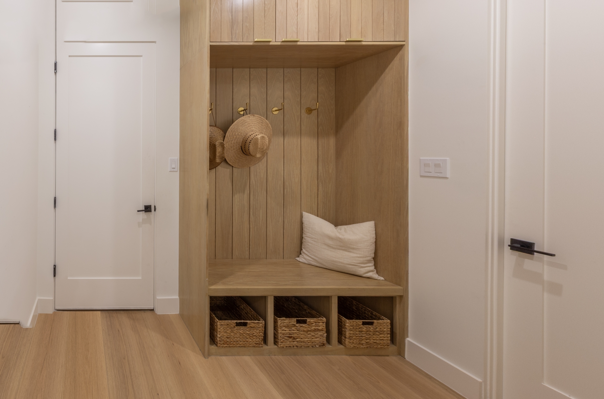 Our Meadowhurst project is a study in organic modern design—where natural textures meet refined minimalism. White oak floors and cabinetry anchor the home in warmth, while handmade beams, Taj Mahal countertops, and zellige tile bring layers of artisanal character. A plaster fireplace and aged brass details complete the look, blending timeless character with modern sensibility.